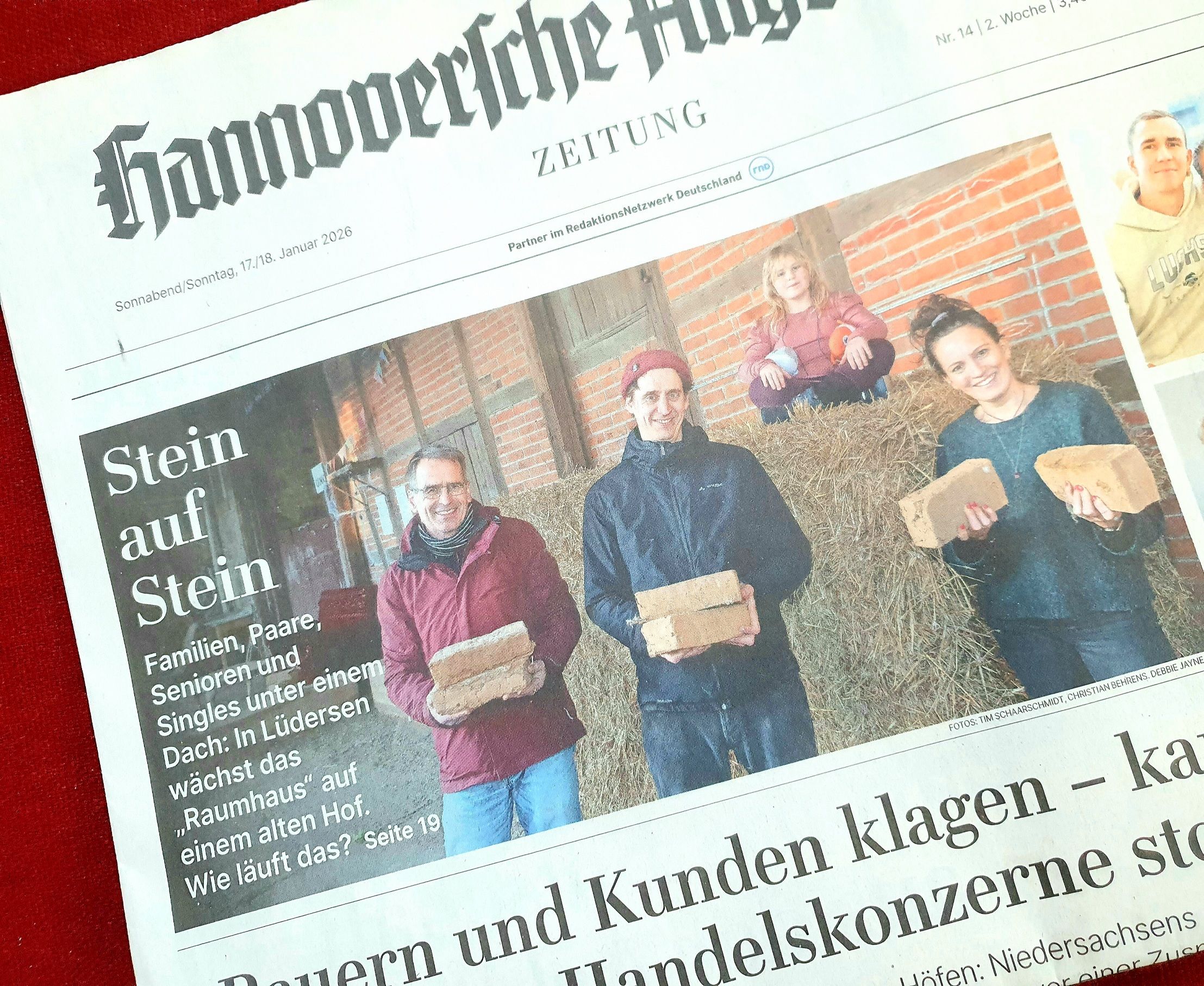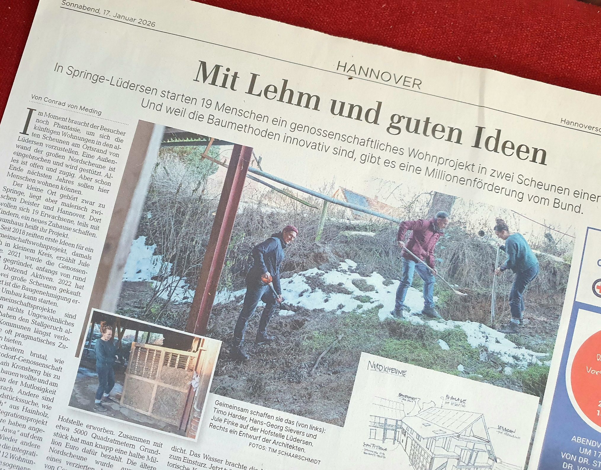 Vorige Woche war ein Redakteur der HAZ auf unserem Hof, weil er gerade einen großen Artikel über Wohnprojekte rund um Hannover recherchierte. Und wohl auf unsere Lehmbau-Förderung aufmerksam geworden war. Ein Fotograf war auch dabei, sodass wir gleich unsere Lehmziegel, Bauskizzen und Schaufeln in die Hand nehmen konnten, um mal zu zeigen, wo unsere Schätze und guten Ideen so schlummern…